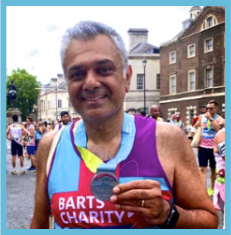 Kulvinder Lall raising £681 for Cardiac Research at Barts Charity at the ASICS London 10K, 21 July 2019 which he ran in 68 minutes.